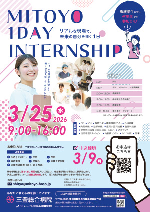 PDFで開く未来の自分にとって様々な選択肢がある三豊総合病院。初めて、春のインターンシップを実施することになりました。ひとことで看護師といっても多様な領域があり、どんな領域で自分が活かせるのかを考えるのはやはり体験をするのが一番近道です。