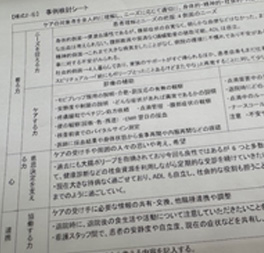 「私の看護観」では、入職後に経験した”忘れられない場面”を振り返り、自分が大切にしたい看護が何なのかを探求します。「ケアプロセス」では、業務に慣れてきたこの時期に、あえて少し時間を確保し、ペアの先輩の指導やアドバイスを受けながら「看護計画」と「業務計画」をじっくり考えます。そして、実践の途中や結果で、より良い看護の提供について見直すことを目的としています。また、「事例検討」は、部署の典型的な症例に対し、ニーズを把握した看護実践に取り組み、シートにまとめ、先輩たちにアドバイスをもらいます。